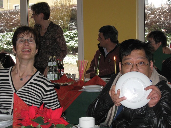 Schon einen Tag vorher konnte man die Vorbereitungen zur Feier beobachten, nach und nach entstand ein stimmungsvoller Saal mit weihnachtlich geschmückten Tischen. Bereits bevor die Türen geöffnet wurden, hatten sich schon zahlreiche festlich gekleidete Bewohner und Mitarbeiter versammelt. Nachdem alle ihre Plätze eingenommen hatten, stieß man erst einmal gemeinsam mit einem Glas Sekt an.