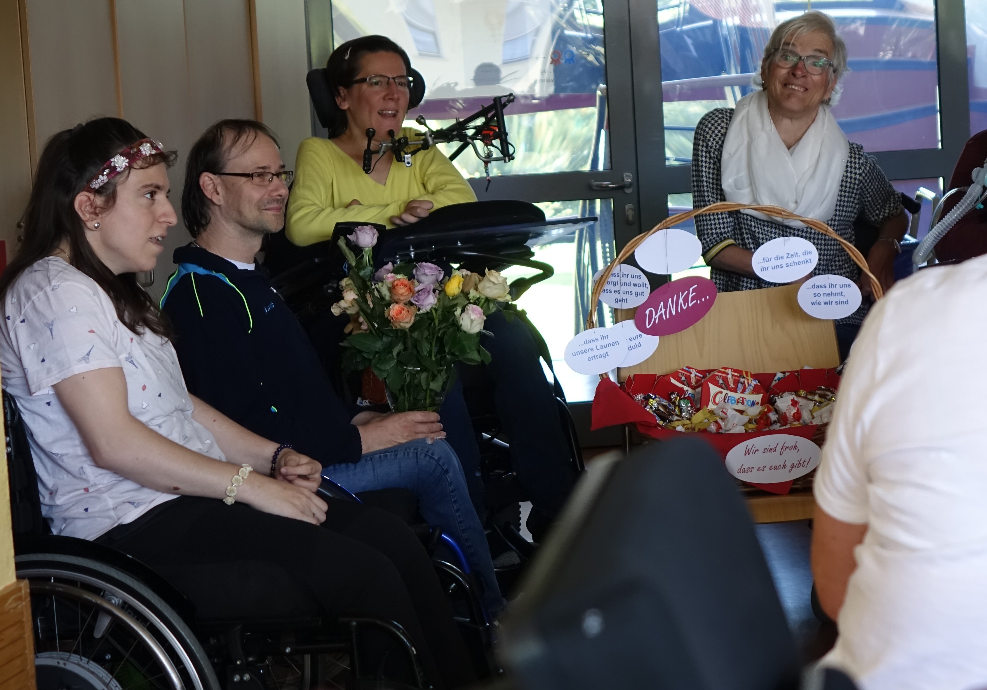 Am Vormittag kam dann die zweite Überraschung. Kurz vor dem Mittagessen überreichten wir den Pflegern des ersten und zweiten Stockes die Körbe mit Nervennahrung und die Rosen.