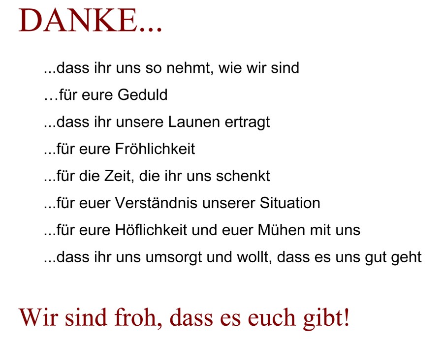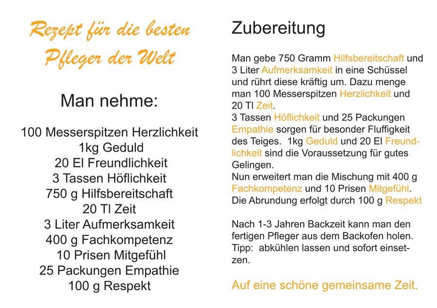 Für die Stellwände schrieben wir ein tolles Rezept für „die besten Pfleger der Welt“. Auf dem beigefügten Foto könnt ihr, liebe Leser, genau nachlesen, welche Zutaten man dafür benötigt und wie die genaue Zubereitung aussieht. Außerdem kreierten wir ein kleines Gedicht für die Pfleger in dem wir uns für alles bedanken, was sie für uns getan haben und in Zukunft noch für uns tun werden.