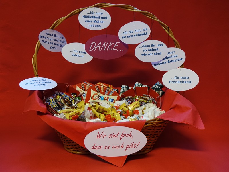 Besonderen Spaß hat mir persönlich das Befüllen und Gestalten der Süßigkeitenkörbe gemacht. Da wir die Körbe noch etwas aufpeppen wollten, kamen wir auf die Idee, diese mit dem Dankegedicht in Form eines Mobiles zu schmücken. Kreative Mitarbeiter unterstützen mich bei der Umsetzung dieser Idee.
