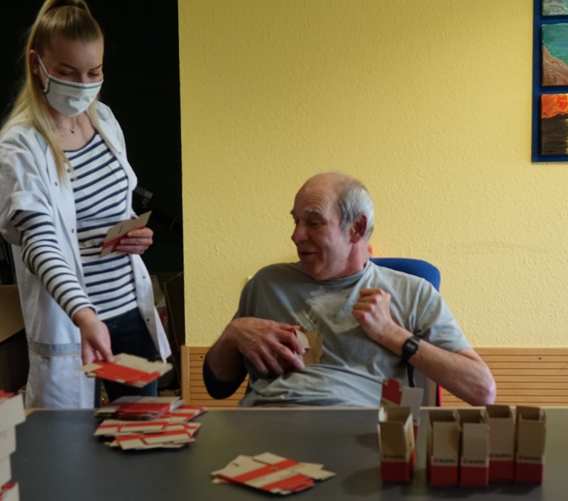 Viele unserer Bewohnerinnen und Bewohner gehen normalerweise in die Werkstätte für Menschen mit Behinderung zur Arbeit (WfbM). Doch momentan bestimmt die Coronakrise mit ständig neuen Verordnungen auch diesen Arbeitsalltag. Im Rahmen einer Notbetreuung besteht die Möglichkeit, in Kleingruppen eine Beschäftigung anzubieten. Die Geschäftsleitungen der WfbM und des Edurd Knoll Wohnzentrums (EKWZ) haben deshalb vereinbart, dass Mitarbieter der WfbM auch hier im Haus eine Gruppe betreuen. Für Bewohner ist die Teilnahme freiwillig, aber für einige Bewohner ist es eine willkommene Gelegenheit, dem Tag eine Struktur zu geben.