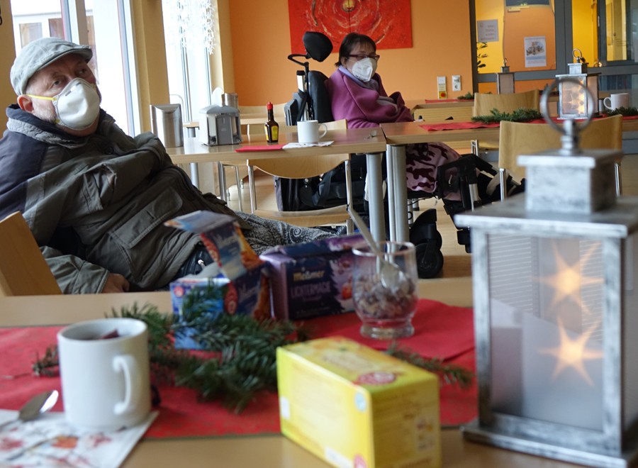 Diebisch freuten wir uns, dass wir im Sommer unseren Ausflug, angepasst an die Corona Maßnahmen, machen konnten. Jetzt im Dezember wäre Essen gehen und einkaufen schon wieder nicht möglich. Doch da kam uns zum Abschluss vor unserer Weihnachtspause Juttas Wunsch gerade Recht. Sie wollte gerne einen Teenachmittag mit uns machen. Jutta hatte dafür extra bei unserem Ausflug nach Bad Mergentheim drei besondere, winterliche Geschmacksrichtungen an Tee eingekauft und hübsche Servietten ausgesucht. Im Speisesaal konnte für die Teestunde jeder einen Tisch belegen, sodass die Regeln eingehalten werden konnten. Anfangs fühlten wir uns etwas verloren, aber wir fanden einstimmig, dass wir doch versucht hatten, das Beste daraus zu machen. Ein grauer Tag wurde durch den Duft von Tee ein kleines bisschen heller.