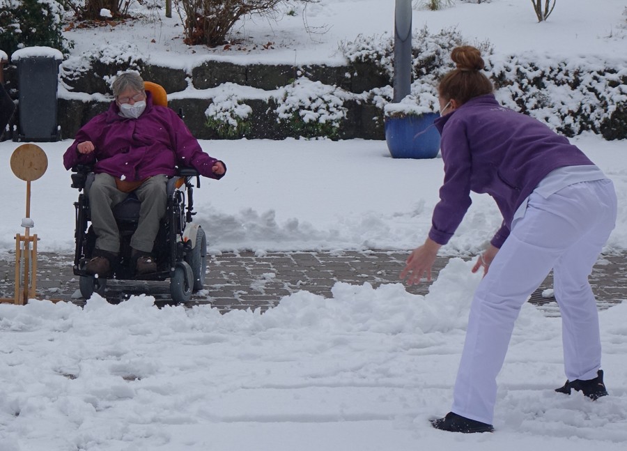 Nur wenige Tage hielt Frau Holles Pracht an, es reichte aber immerhin für eine spontane Schneeballschlacht und regte eine Mitarbeiterin an, die Schaumkuss-Wurfmaschine kurzerhand in eine Schneeball-Wurfmaschine umzuwandeln. Sie bereitete reichlich Wurfgeschosse vor, an denen unter Mithilfe einer Bewohnerin keiner im Hof vorbeikam.