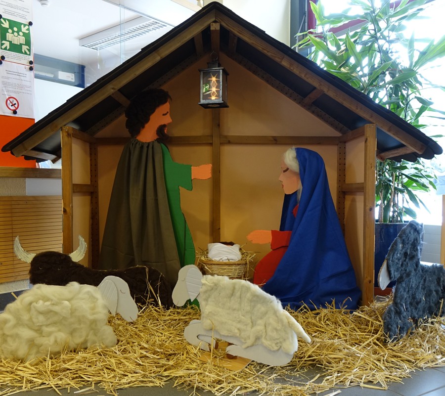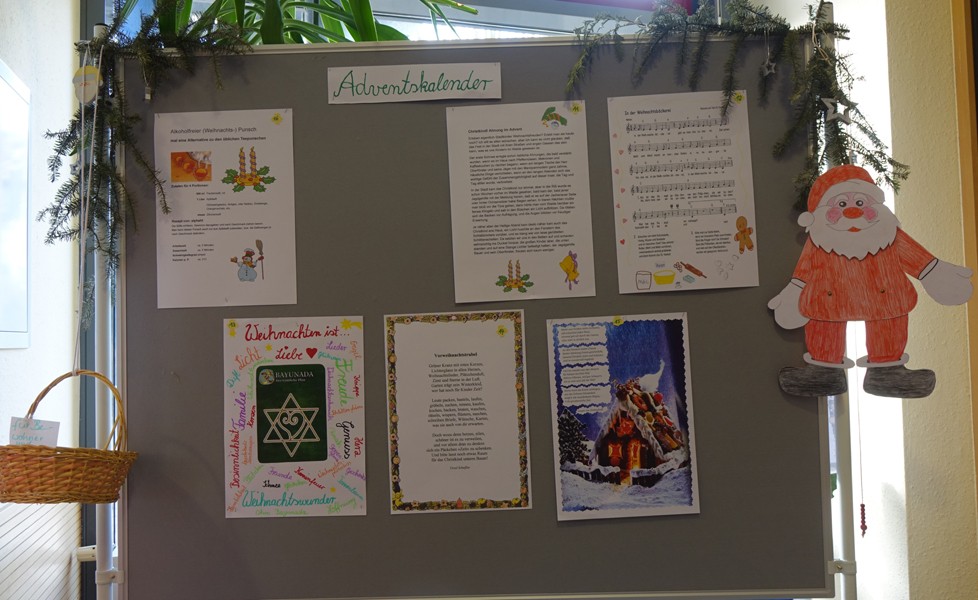 Seit langem wurde mal wieder eine Weihnachtskrippe gestaltet. Dafür haben einige Bewohner große Figuren ausgesägt und Kleidung gebastelt, einen „Stall“ gezimmert und alles zusammen im Foyer aufgebaut. Dort findet sich auch an einer Stellwand ein Adventskalender, den die Mitarbeiter zusammen mit Bewohnern gestalten. Sie sammelten dafür für jeden Tag eine Idee. Man findet dort beispielsweise ein neues Plätzchenrezept, kann sich aus einem Körbchen eine Süßigkeit nehmen, oder konnte am Nikolaustag einen Nikolaus-Hampelmann tanzen lassen.