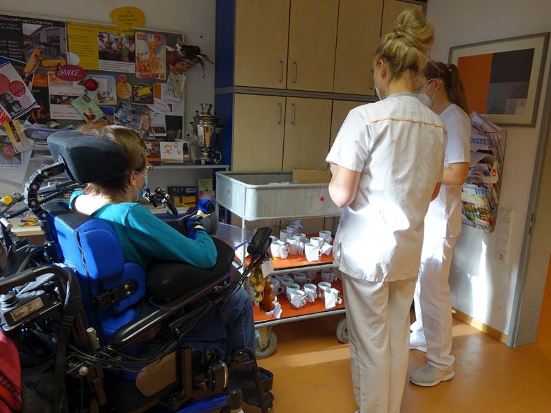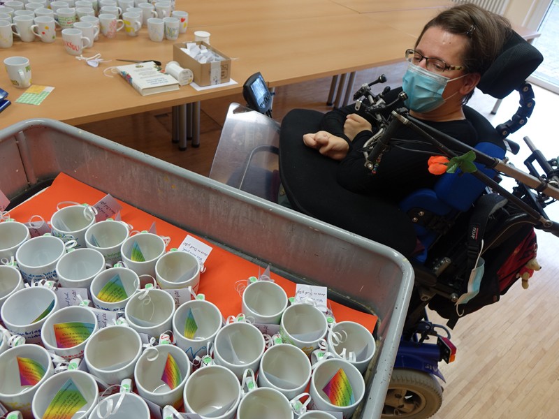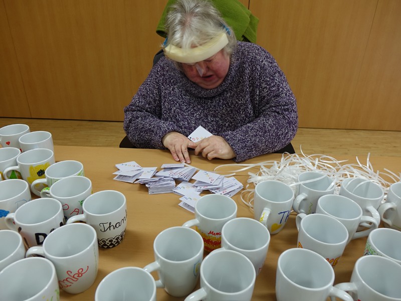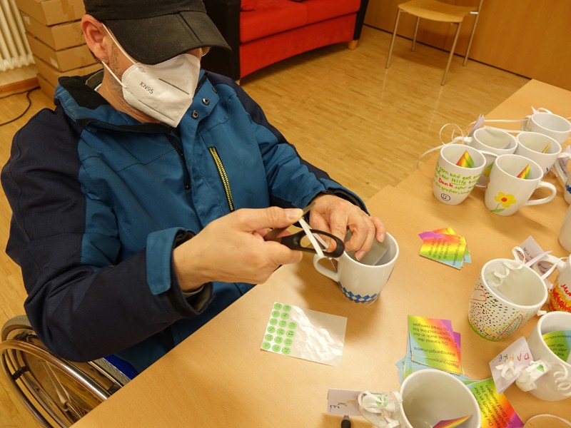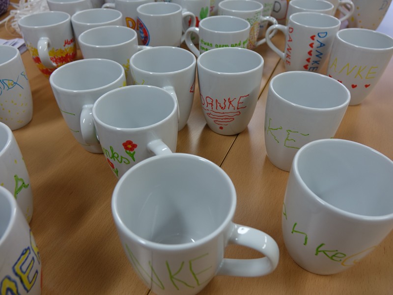Zusammen mit einigen Mitbewohnern und Mitarbeitern der Tagesstrukturierung nahmen wir uns an drei Sonntagen Zeit, die einzelnen Tassen mit viel Liebe individuell zu gestalten. Auf alle Fälle sollte das Wort „Danke“ darauf stehen, ansonsten war jedem frei überlassen, wie er weiterhin das Gefäß gestaltete. Alle Mitwirkenden sind sehr über das Ergebnis begeistert und erstaunt darüber, wieviel Phantasie jeder Einzelne in sein Werk gesteckt hat.