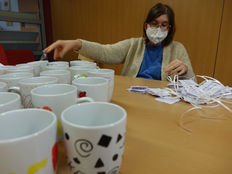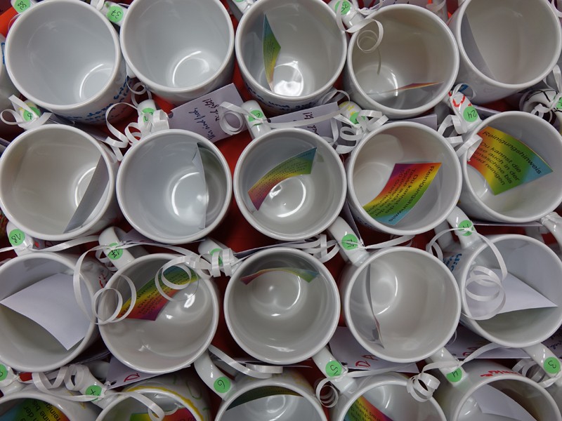 Auch für die Verteilung der Tassen hatten wir eine Lösung - ein Tombola-System. Jeder Mitarbeiter durfte sich aus einer Kiste einen Zettel mit einer Nummer zwischen 1 und 120 ziehen und mit Hilfe der Klebepunkte „seine persönliche Tasse“ ermitteln.