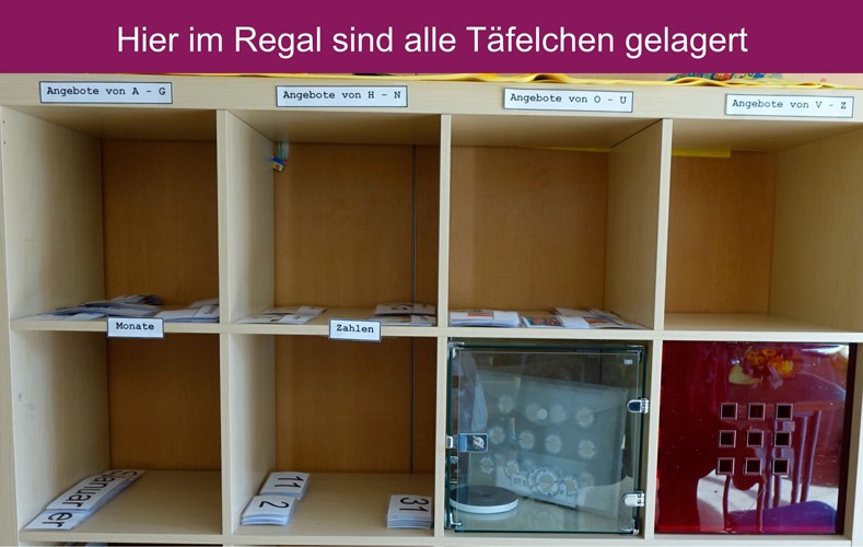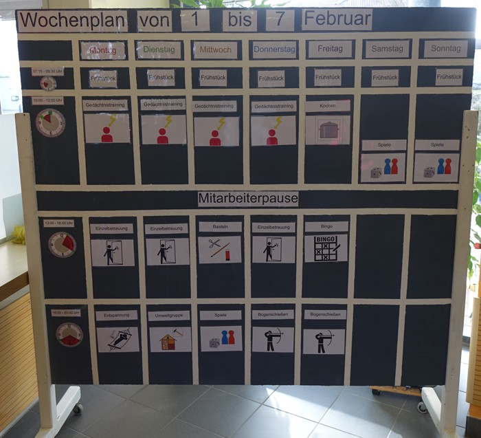 Unter dieser Vorgabe tauschten sich daraufhin Mitarbeiter aus verschiedenen Abteilungen aus und sammelten Ideen für eine Umsetzung. Schnell war klar, dass die Aufteilung für die Angebote der Tagesstrukturierung wieder, wie schon bisher, jeweils für eine Woche gezeigt werden sollten. Ein Angebot sollte aber in der Darstellung zum besseren Verständnis mit Text und Bild beschrieben werden. Das alles wäre durch eine magnetische Stellwand praktisch gut umsetzbar.