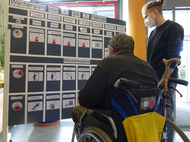 Manchmal braucht es einen Anstoß von Außen, damit etwas Neues entsteht. So war es auch bei uns. Einen Anstoß bekamen wir durch Mitarbeiter des Medizinischen Dienstes der Krankenversicherung (MDK). Bei einem Rundgang durch unser Haus, fiel den Mitarbeitern des MDK auf, dass Angebote unserer Tagesstrukturierung lediglich in Tabellenform an einer Stellwand im Foyer veröffentlicht werden. Da aber die Teilhabe aller Bewohnerinnen und Bewohner ermöglicht werden soll, regten sie eine „barrierefreie Darstellung“ an.
