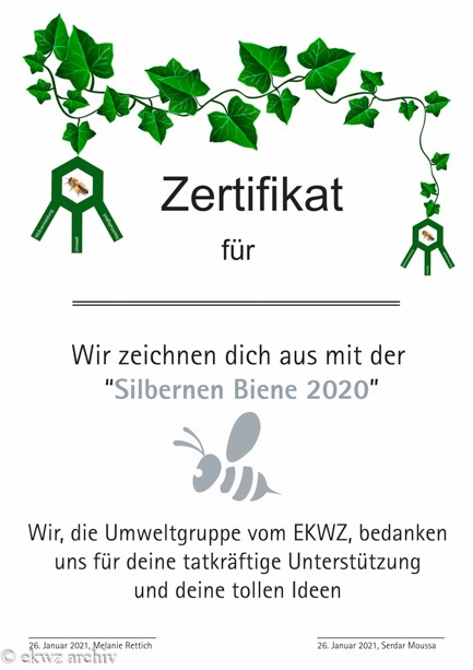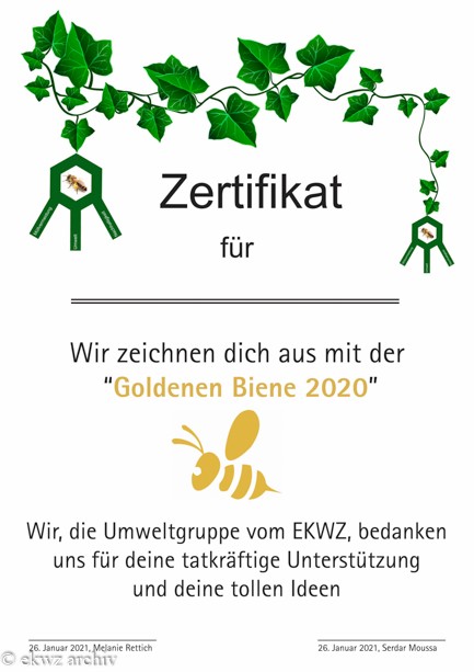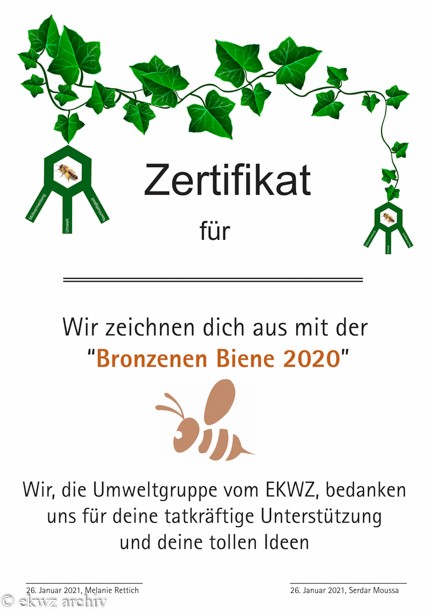 Ende des letzten Jahres hatte Serdar den Vorschlag, eine Urkunde an das fleißigste Mitglied der Umweltgruppe zu überreichen. „Es wäre doch schön, denjenigen zu belohnen, der sich am meisten in der Umweltgruppe engagierte und die meisten Ideen einbrachte.“ Gleich waren Alle von dieser Idee sehr begeistert. So einigten wir uns, eine Urkunde für die Plätze 1-3 zu gestalten. Zusammen mit Johanna, einer Mitarbeiterin der Öffentlichkeitsarbeit, machte ich mich an die Arbeit. Mit der Zeit entstand ein sehr schönes Ergebnis. Die Sieger bekommen nun die „goldene, silberne und brozene Biene 2020“ überreicht.