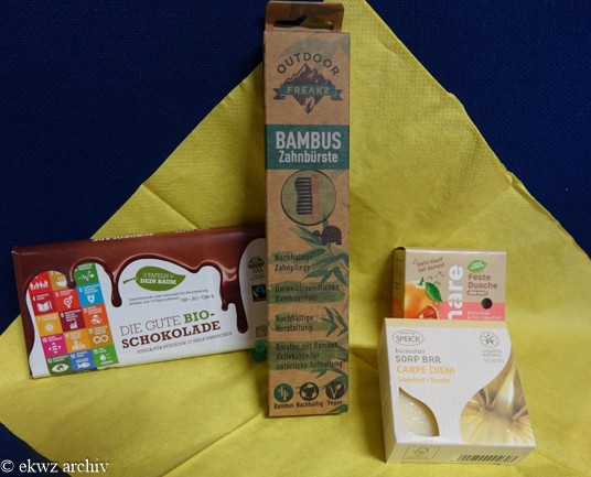In der Woche darauf fand die Siegerehrung statt. Jedem der Sieger wurde die passende Urkunde und ein kleines Geschenk überreicht. Melanie und Serdar hatten für uns ein Präsent zusammengestellt. Martin und ich bekamen jeweils eine Bambuszahnbürste, 2 Seifen und die „Gute Bio-Schokolade“.