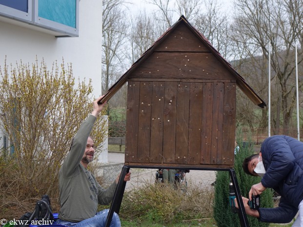 Mittlerweile war der Herbst in´s Land gezogen. Zusammen entschieden wir uns, erst im Frühjahr 2021 das Hotel an seinen geeigneten Platz zu stellen. Über die Wintermonate machten wir uns über einen sinnvollen Standplatz Gedanken. Wir einigten uns auf das Blumenbeet neben dem Parkplatz am Hohenloher Integrations Unternehmen.