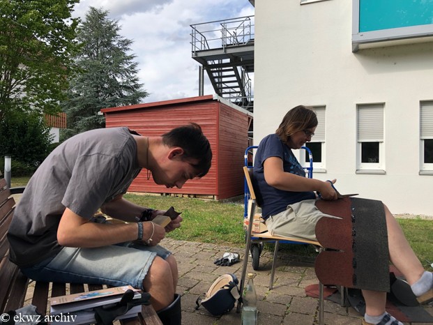 Dann endlich konnten wir mit dem Bau der großen Unterkunft starten. Die Mitarbeiter vom EKWZ Melanie und Serdar unterstützten uns tatkräftig. Vor allem Serdar, mit seinen guten Ideen und seinem handwerklichen Geschick, bereicherte unsere Gruppe.