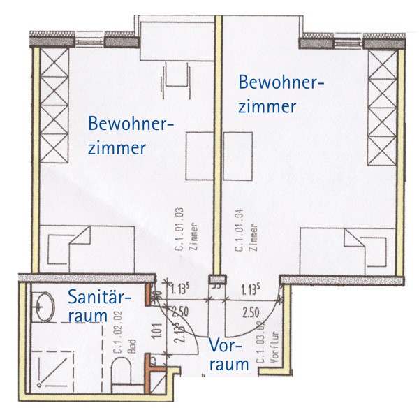 Die Zimmer sind ca. 18 qm groß und verfügen jeweils über einen Telefon-, TV- und Internetanschluss. Jeweils zwei Bewohner teilen sich eine Nasszelle.