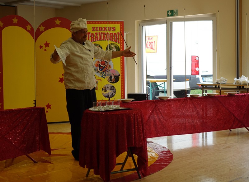 Schon bevor die Vorstellung begann, zog ein Duft von frisch gemachtem Popcorn durch´s Haus. Während sich immer mehr Bewohner*innen versammelten, stieg die Spannung auf die Zirkusvorstellung. Der Zirkus Frankordi ist ein reiner Familienzirkus. „Die Hauptakteure der Show sind wir“, so beschreibt sich die Familie selbst auf ihrer Homepage „wobei die Nachwuchsartisten Jason, Naomi und Joel besonders beliebt bei den Zuschauern sind“. Zuerst begrüßte uns der Nachwuchs mit einer kleinen Clown-Nummer. Danach kam Zirkusdirektor Frankordi und eröffnete das Programm mit Fanfaren-Musik. Das Programm war sehr abwechslungsreich, es gab eine Hundedressur, Jonglierdarbietungen mit drehenden Tellern auf einem Stab zur Musik von Elvis Presley, mehrere Comedy-Einlagen mit den Kindern, Hula-Hoop Artistik und Bälle wurden auf einem Balance-Board jongliert. Auch für Zauber-Fans war etwas dabei, in Windeseile verwandelte sich Frau in Mann oder Frau wurde zerteilt. Alle Familienmitglieder waren voll im Einsatz, selbst der Kleinste zeigte sein Können. Die Zuschauer belohnten die schönen Darbietungen mit großem Applaus und durften sich dann auch noch über eine Zugabe freuen.