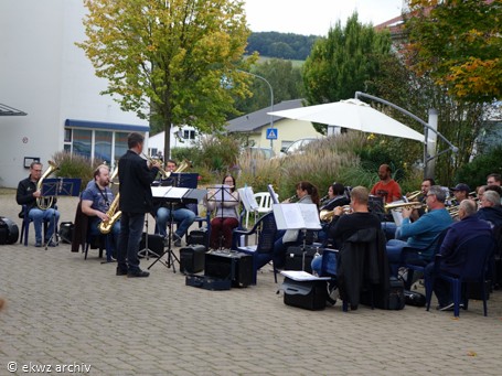 Am 3. Oktober, dem Sonntagvormittag, bekamen wir Bewohner*innen vom Eduard-Knoll-Wohnzentrum ein besonderes Highlight geboten. Extra für uns kamen zwanzig Musiker*innen der Stadtkapelle Krautheim zu uns in´s Wohnzentrum. Im Hof für alle gut sichtbar, platzierten sie sich im Halbkreis.