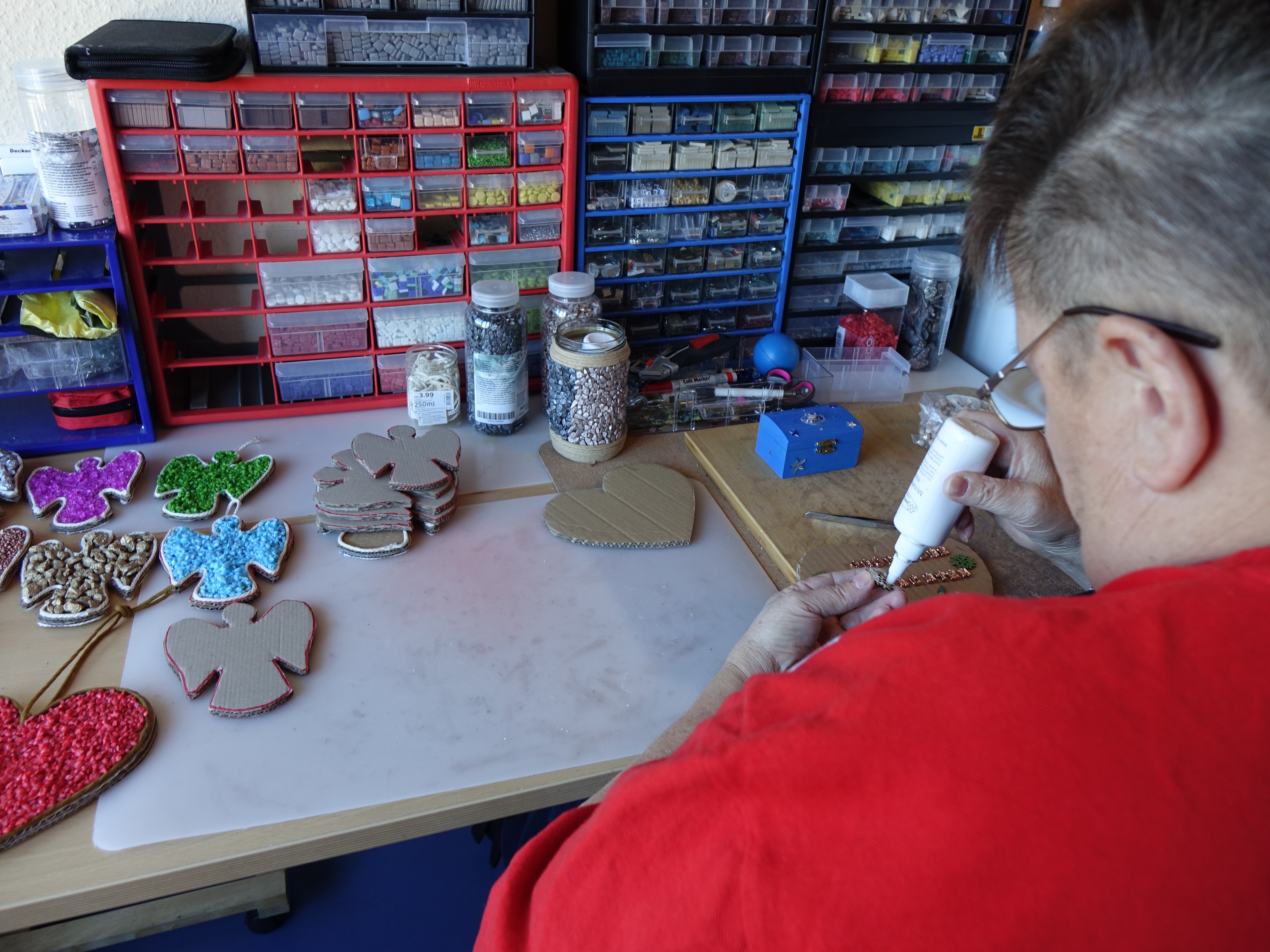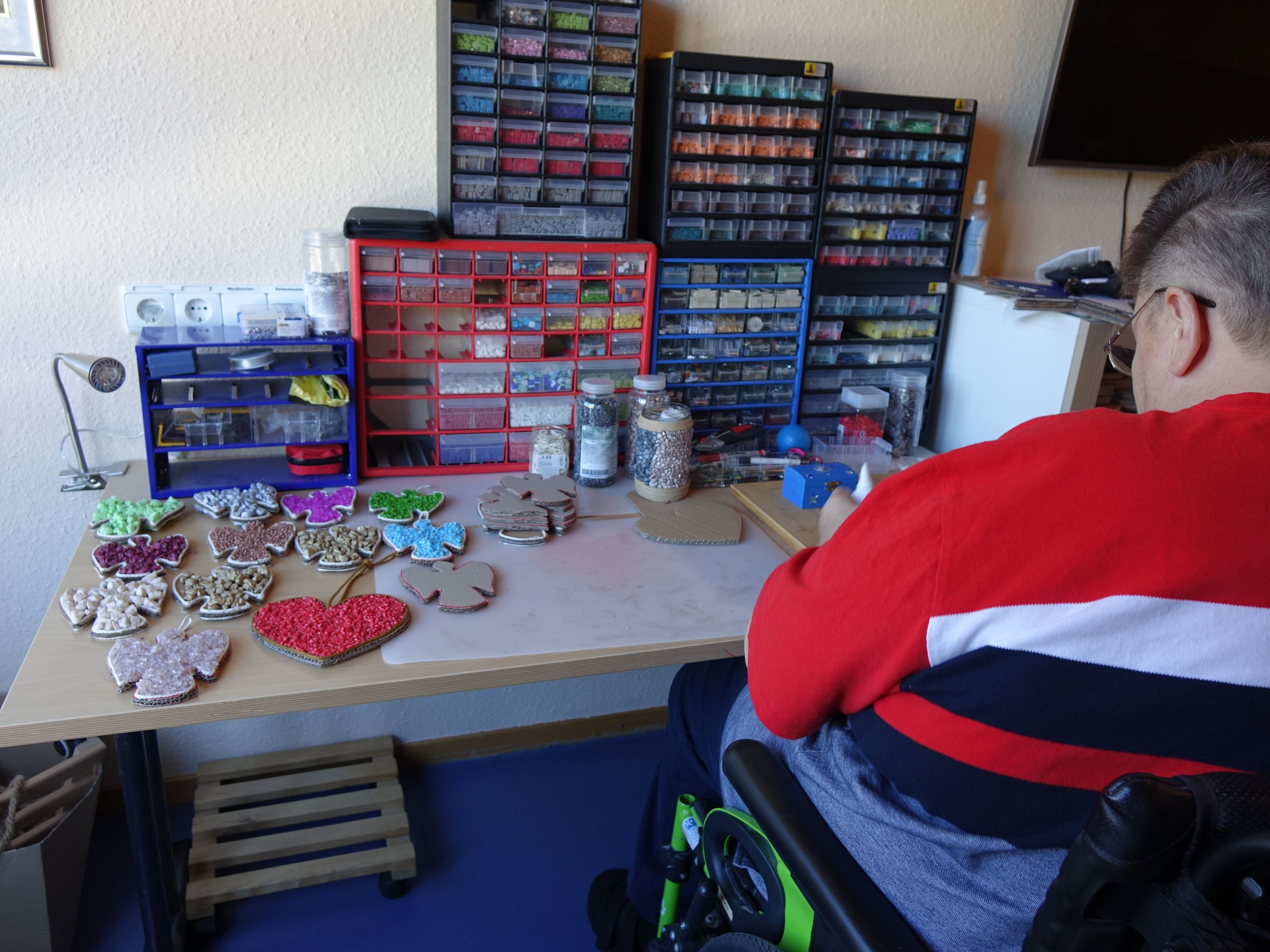 Und weil ich anderen gerne helfe, kam ich auf die Idee, Mitbewohner zu motivieren und an meinem Hobby teilhaben zu lassen. Es macht mir Freude, wenn sie zu mir kommen und ich sie anleiten kann, oder wenn ich sehe, wie sie selber etwas Neues ausprobieren und sich ganz in ihre Arbeit vertiefen. Die Arbeit mit den unterschiedlichen Steinen ist wie eine Bewegungs-Therapie für die Finger. Oft unterhalten wir uns bei der Arbeit über alle möglichen Themen, auch das ist für mich eine große Bereicherung.