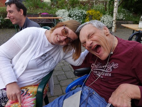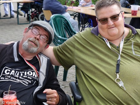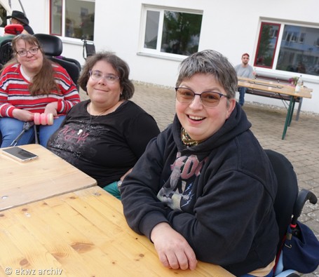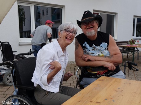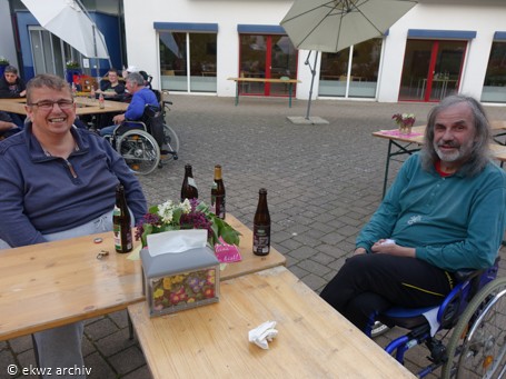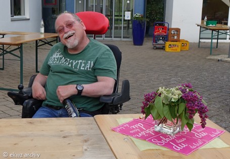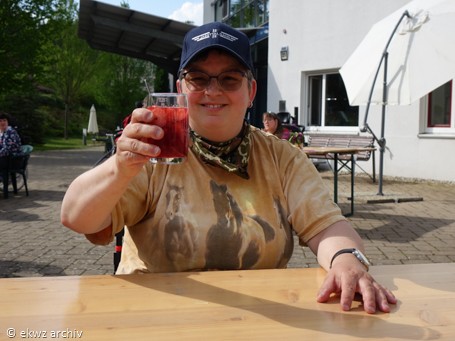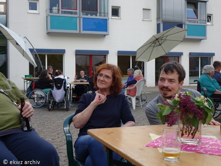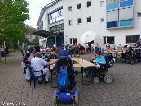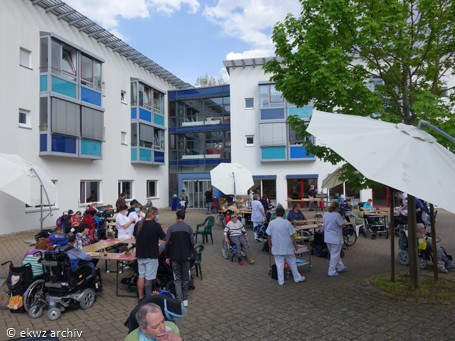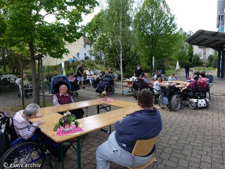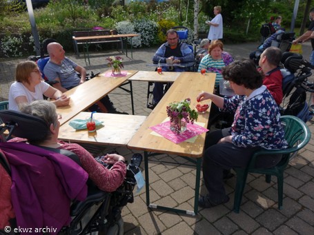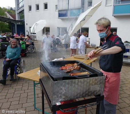 ... draußen zusammen zu feiern. Umsomehr konnten wir es am 3. Mai bei unserer „Eröffnung der Grillsaison“ genießen. Schön geschmückte Tische, Sonnenschirme und Musik luden die Bewohner*innen ein, nach draußen zu gehen und sich auf einen leckeren Grillteller zu freuen. Zuerst gab es aber für alle, die wollten, eine selber zubereitete Erdbeerbowle. Die Mitarbeiter der ergo hatten zusammen mit Bewohner*innen morgens dafür fleißig frische Erdbeeren geschnippelt.