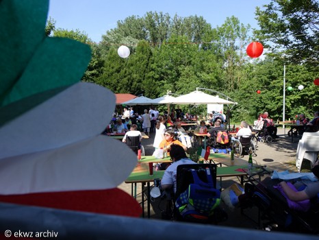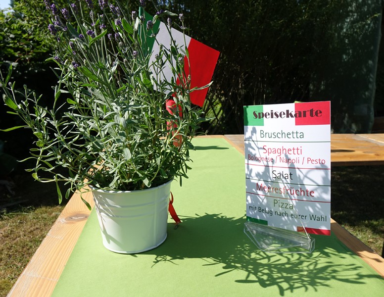 Beim Blick auf den schönen Platz hinterm Haus war das Motto für jeden leicht zu erkennen. Rot, weiß und grün waren die Farben der Dekoration. Über den Tischen schaukelten Lampions und auf den Tischen wiederholten sich die Farben in den Servietten, den Tischdecken und Fähnchen. Italienisches gab es aber nicht nur für die Augen und den Gaumen, schon einige Zeit vorher auch schon auf die Ohren. Von Albano und Romina Power über Eros Ramazzoti oder Pavarotti bis zu Original Italienischen Instrumentalstücken, alle Richtungen waren vertreten. Schnell füllte sich der Platz. An diesem fast schon heißen Tag waren die begehrtesten Plätze unter der Linde und unter den Sonnenschirmen.