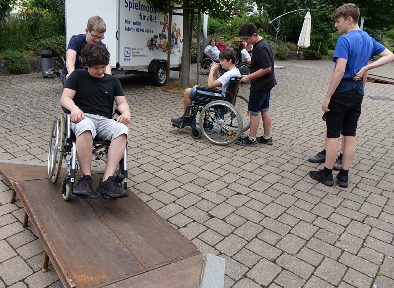 Als die Schülerinnen und Schüler im Eduard-Knoll-Wohnzentrum ankamen wurden sie bereits herzlich von den dortigen Bewohnerinnen und Bewohner sowie von Frau Maisch aus dem EKWZ empfangen. Diese teilten die Kinder in Gruppen auf, die dann verschiedene Stationen absolvierten. Sie veranstalteten ein Rollstuhlwettrennen um das Haus und bewältigten einen Hindernisparcours bei dem sie mit dem Rollstuhl sowohl bergauf, bergab, über eine Schräge und über eine Wippe fahren mussten. Eine große Herausforderung für die ungeübten Jugendlichen! Eine weitere Station stellte der Hütchen-Parcours dar, welcher sogar blind nur durch Anweisungen der Teammitglieder bewältigt werden musste.