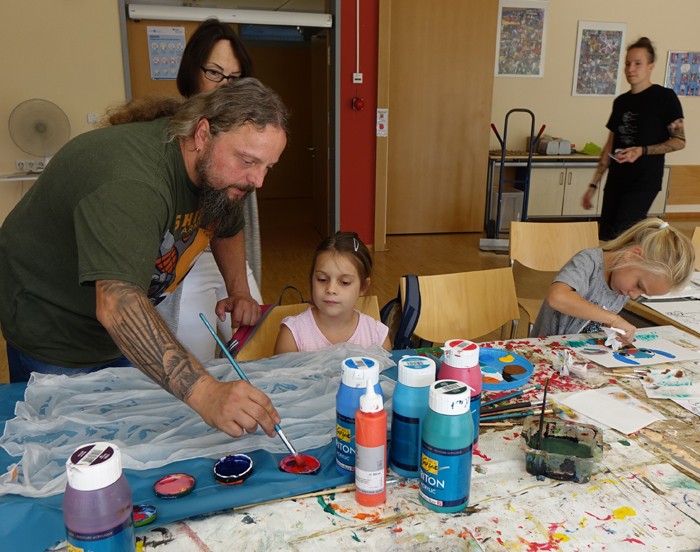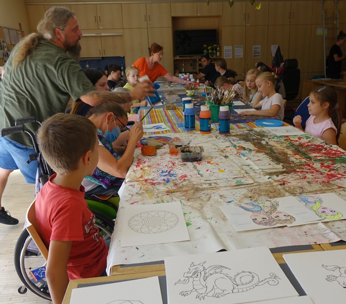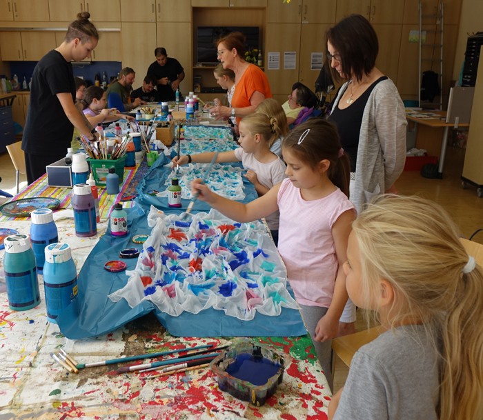 Pünktlich trafen die Kinder ein und gleich nach einer kurzen Begrüßung zeigte Regina, die Leiterin der Tagesstrukturierung, sämtliche griffbereit verteilte Malutensilien und die vorbereiteten Vorlagen. Anfangs war die Stimmung noch etwas verhalten, aber schon bald tauchten die Kinder in das Reich der Farben ein. „Rot, ich brauche rot, ich brauch noch gelb für die Sonne“, halfen sie sich gegenseitig und tauschten untereinander ihre Farben. Es war schön zu beobachten, wie konzentriert die kleinen und großen Künstler an´s Werk gingen, manche schafften sogar mehrere Vorlagen auszumalen. Wer dann noch Zeit hatte, für den zauberten die Mitarbeiter der Tagesstrukturierung sogar noch Seidentücher hervor. Sie zeigten den Kindern wie sie mit einigen Tricks wunderbare Farbeffekte erzeugen konnten. Zum Glück half auch noch das Wetter mit, denn die Sonne trocknete die Tücher rechtzeitig, sodass alle Kunstwerke pünktlich fertig wurden.