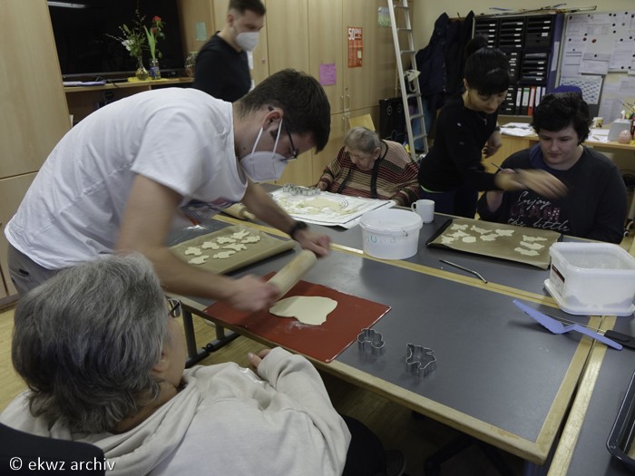 Nach einer Begrüßung mit Kaffee ging es direkt in die Räumlichkeiten unserer Tagesstrukturierung. Dort hatten wir Tische mit unterschiedlichen Angeboten wie Memory, Basteln, Backen und Seidenmalen vorbereitet. Einige Bewohner*innen warteten schon um loszulegen und so waren die Schüler*innen gleich mittendrin. Sie haben sich alle sehr schnell eingebracht und mit angepackt. Berührungsängste waren absolut nicht zu spüren. Die Dreiviertelstunde verging rasend schnell und schon ging es zum nächsten Programmpunkt, einer Hausführung. Dafür hatten sich wieder in bewährter Weise einige Bewohner*innen bereit erklärt. Ihnen hat es sehr viel Spaß gemacht, vor allem, weil die Schüler*innen so viel Interesse gezeigt haben und so offen waren.