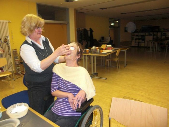 Dies war am Dienstag, 30. März 2010 im Eduard Knoll Wohnzentrum möglich. Vier Frauen und ein Mann genossen es bei sehr schöner Meditationsmusik, von Brigitte und Helena im Raum der Tagesstrukturierung durch wunderbare Gesichtsmasken verwöhnt zu werden. Die Teilnehmer rollten nacheinander ein, so dass niemand lange auf sein Verwöhnprogramm warten musste. Die Gesichtsmasken bestanden nur aus Naturprodukten, wie z.B. Eiweiß, Zitronen, Quark und Honig. Schon die Gesichtsreinigung erzeugte ein angenehmes Gefühl auf der Haut. Mit der Gesichtsmaske erlebten die Teilnehmer eine wunderbare Entspannung. Die Haut lebte richtig auf.