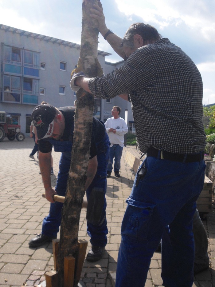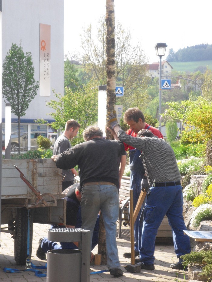 Alleine schon das Abladen, bzw. das Hiefen des Baumstamms in das dafür vorgesehene Loch gestaltete sich, trotz vieler helfender Hände, etwas schwierig. Alle Helfer brauchten viel Geduld und ein gutes Augenmaß.