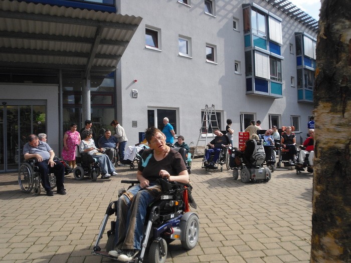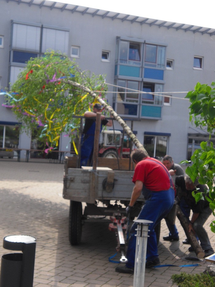Ziemlich genau um 10:00 Uhr kam am Freitag, den 30. April 2010 ein Traktor mit Anhänger in den Vorhof des Eduard-Knoll-Wohnzentrums gefahren. Darauf befand sich unser Maibaum.