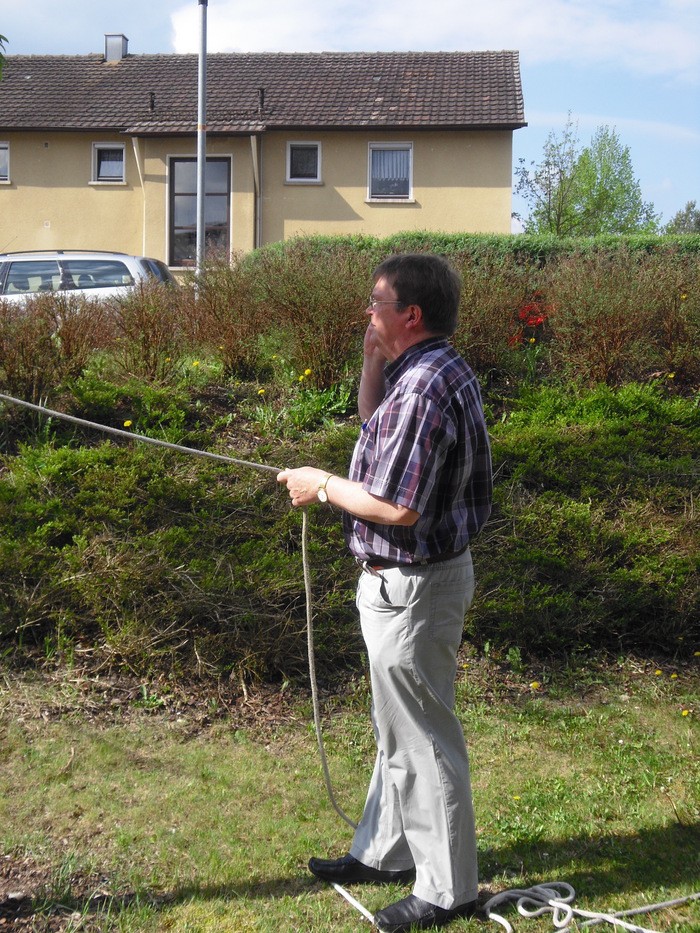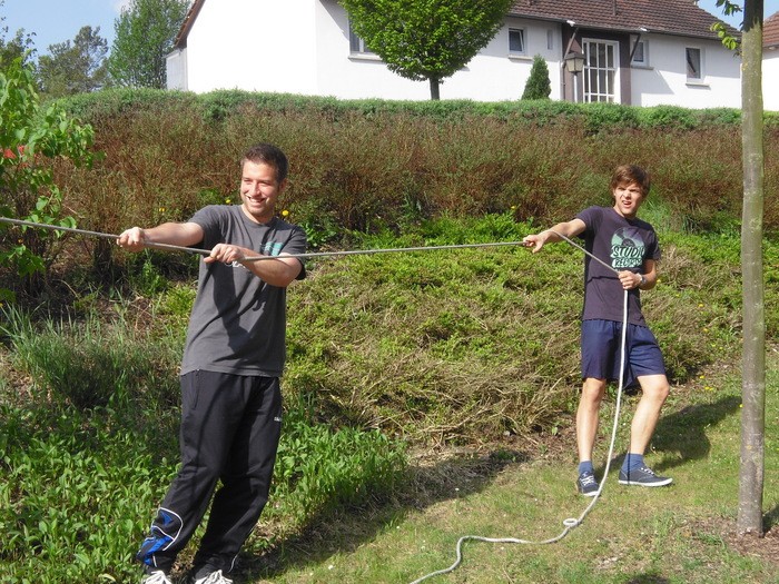 Die zündende Idee waren zwei Seile, die von zwei starken Männern, unseren Feuerwehrbeauftragten Alexander Seuferlein und unserem mit übermenschlich ausgestatteten Kräften Sozialarbeiter Volker Raidt gehalten wurde.