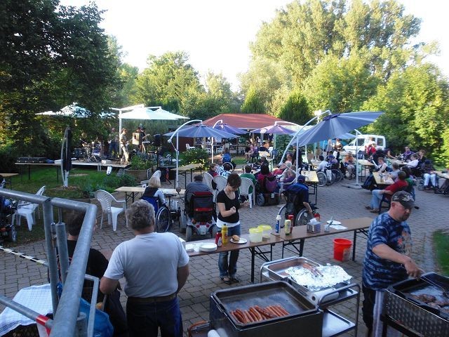 Auch für das leibliche Wohl war gesorgt worden. Der Grill wurde eingeheizt und darauf lagen Steaks und Würstchen, die von Helmut Gaab, dem Koch des Wohnzentrums persönlich gegrillt wurden. Viele fleißige Hände, wie das Ergo-Team, waren dabei, die Bewohner mit den Köstlichkeiten zu verwöhnen. Auch das Bier und andere Getränke flossen reichlich.