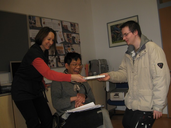 Eine Mitarbeiterin der Abteilung Tagesstrukturierung hat mir erklärt mit welchen Hilfsmitteln sie sich mit den Bewohnern verständigt. Z.B gibt es eine Buchstabentafel mit Zeigestock oder auch eine Buchstabentafel für entsprechende Kopfbewegungen. Dabei bedeutet ein I = Kopf oben, Kopf unten, Kopf rechts. Ein c = Kopf oben, Kopf oben, Kopf rechts. Ein h = Kopf oben, Kopf unten, Kopf gerade. Diese Bewegungen ergeben das Wort „ich“. Dann gibt es noch ein Sprachausgabegerät, in das man seine Worte eintippen kann.