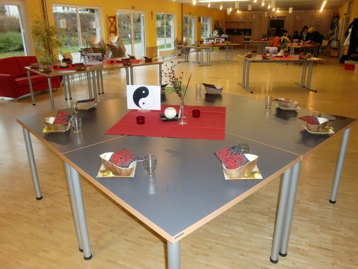 Schon früh am Morgen begann unsere Deko-Künstlerin und Pflegedienstleiterin Regina Rudolph den e.r.g.o.-Raum dem Motto entsprechend herzurichten. Die Tische wurden mit asiatischen Motiven, Räucherstäbchen und Servietten mit chinesischen Symbolen dekoriert. An die Decke kamen Lampions aus Seidenpapier. Die Wände wurden mit chinesischen Schriftzeichen geschmückt.