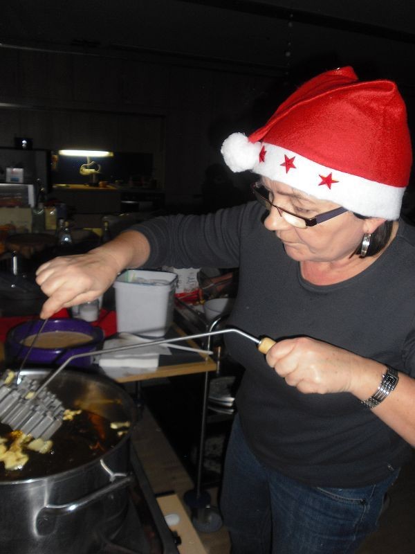Das Küchenteam hatte eine Gulaschsuppe vorbereitet, die von den Mitarbeitern serviert wurde und sehr lecker war. Eine weitere Überraschung waren die „Rosenküchle“,, die im heißen Fett gebacken und warm gegessen wurden. Eine spezielle Form ließen sie wie „Rosen“ aussehen. Zu verdanken hatten wir diese Spezialität dem Kontakt von Helena Szymansky zum Schöntaler Kulturverein. Dieser stellte uns den Teig wie auch schon im vergangenen Jahr zur Verfügung.