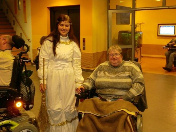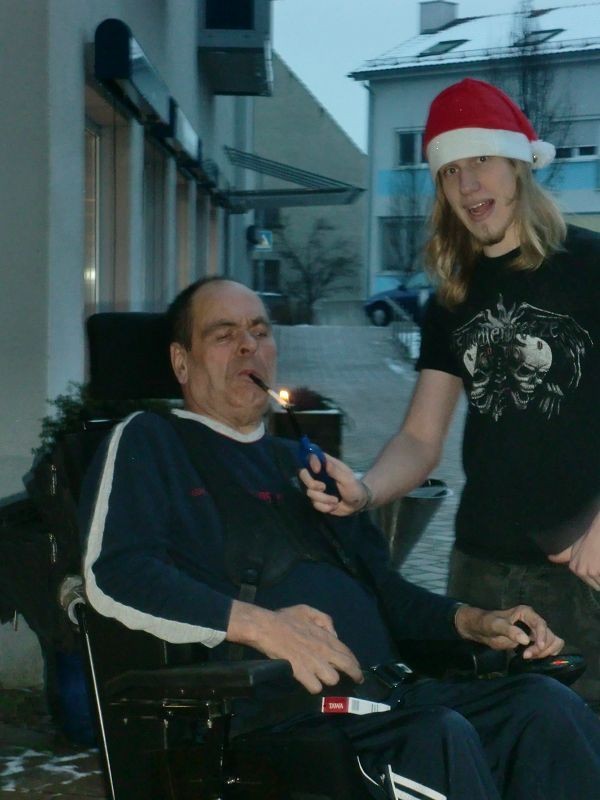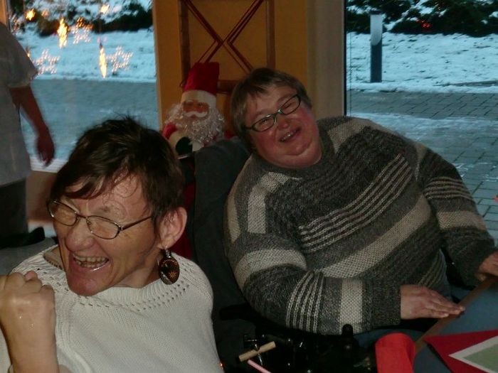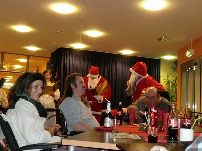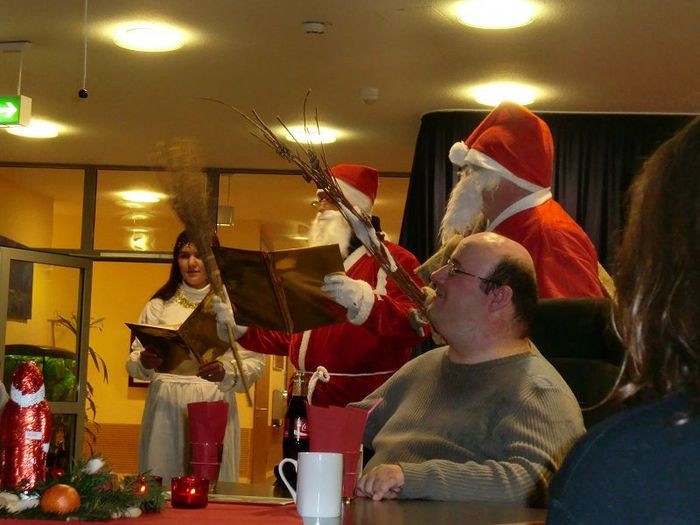 Der Raum war gut gefüllt, als man von draußen Pferdehufe hörte. Der Nikolaus kam hoch zu Ross und hatte Knecht Ruprecht dabei. Beide wurden von einem Engel begleitet. Als sie den Raum betreten hatten, trugen alle drei ein Gedicht vor: „Von draußen vom Walde …“. Außerdem hielten die vorweihnachtlichen Gäste für die Bewohner eine süße Überraschung bereit, sie überreichten jedem einen Schokoladen-Nikolaus. Nikoläuse haben immer wenig Zeit und so verabschiedeten sie sich bald wieder, mit dem Pferd trabten sie davon. Im e.r.g.o.-Raum wurden in diesen Momenten schöne Weihnachtslieder gespielt.