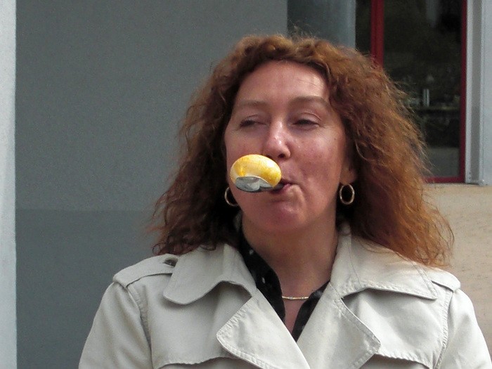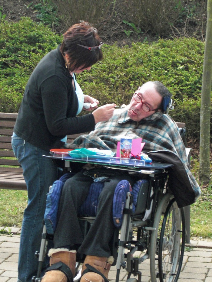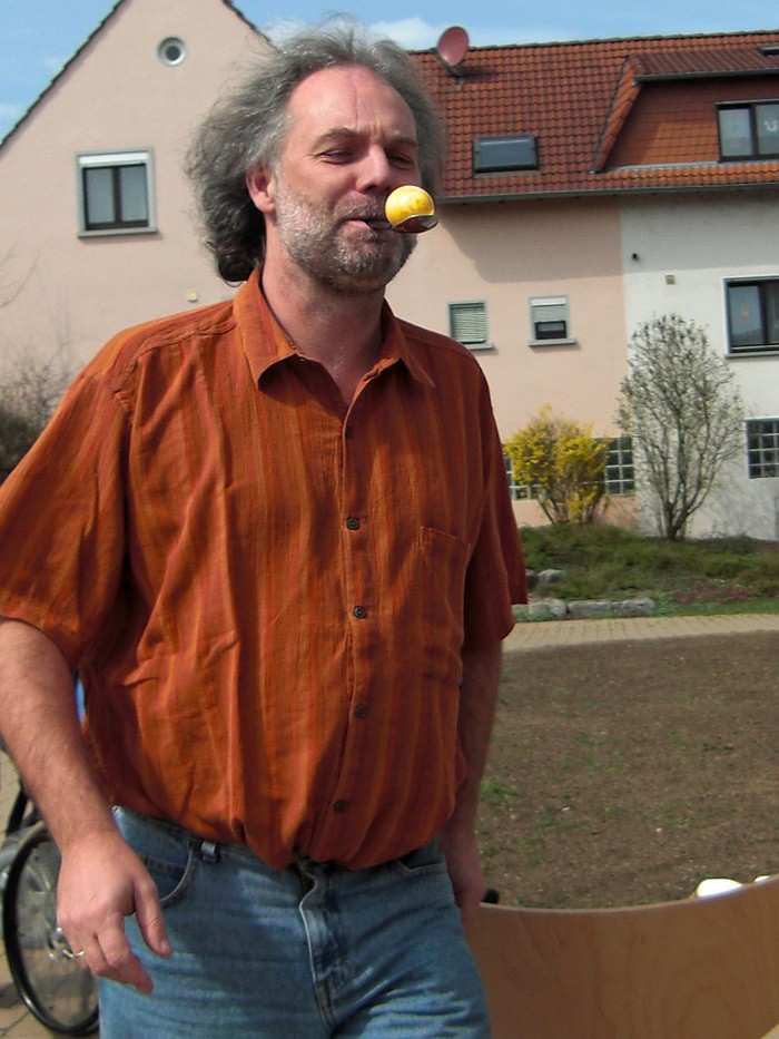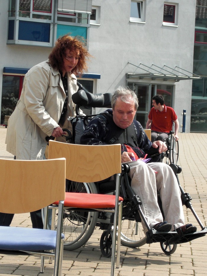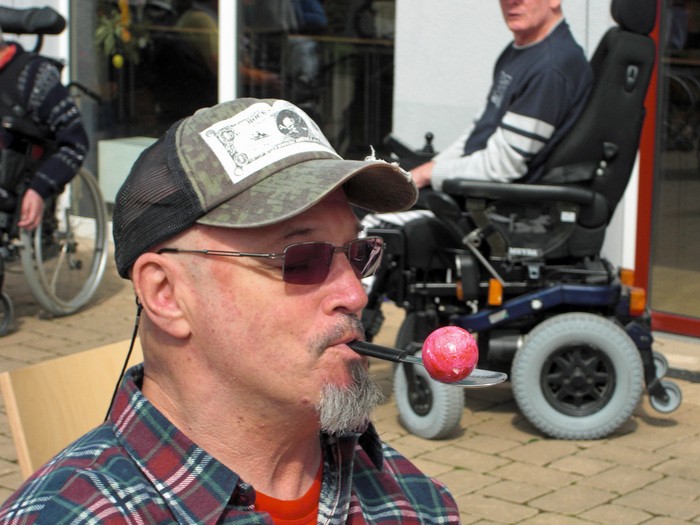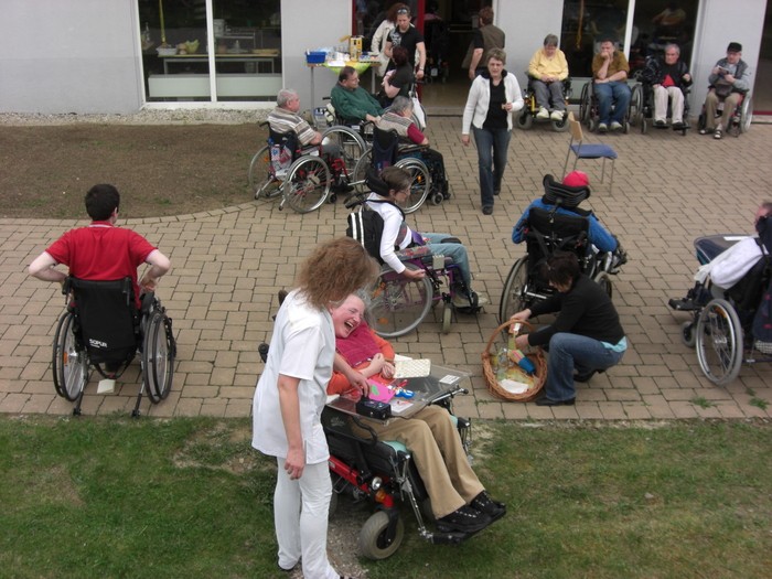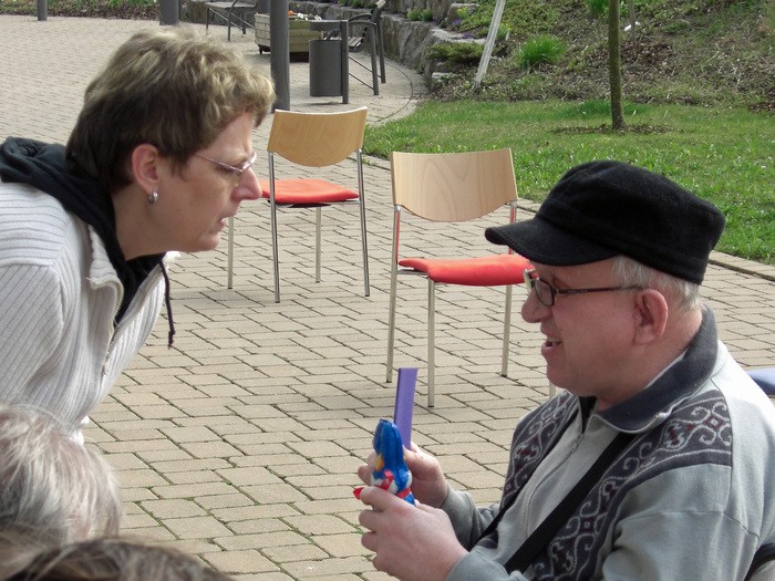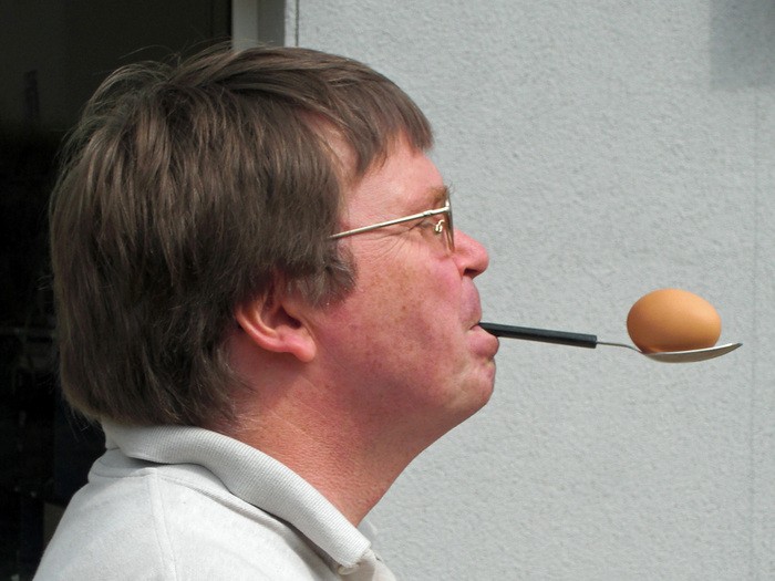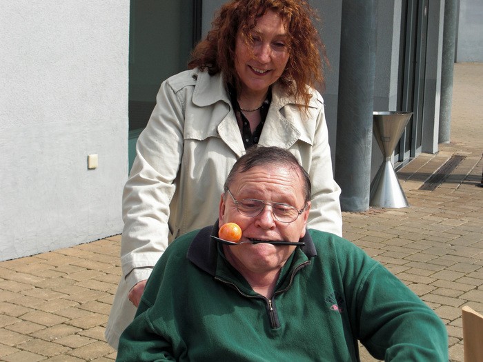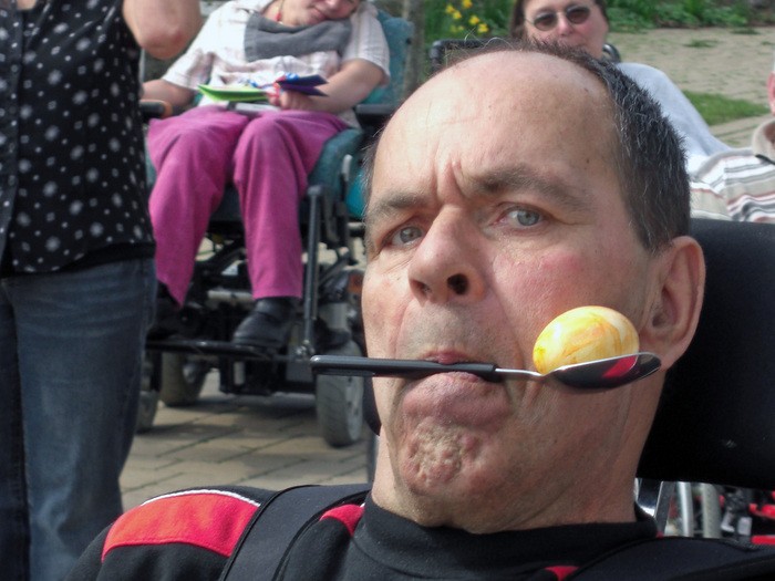 Jeder startete seinen Lauf auf seine Weise. Man brauchte dazu sechs Stühle, einen Löffel, hart gekochte Eier und jede Menge Leute, die mitmachten und anfeuerten. Um die Stühle wurde Slalom gefahren und jede Bewohnerin, jeder Bewohner hielt den Löffel auf seine Weise. Diejenigen, die den Löffel nicht mit der Hand balancieren konnten, versuchten es mit dem Mund oder klemmten den Löffel am Rollstuhl fest. Wer nicht selber fahren konnte, dem wurde geholfen. Das Ei musste die ganze Zeit auf dem Löffel bleiben.