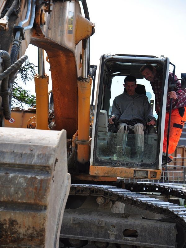 Klaus Lehmann wohnt im Eduard Knoll Wohnzentrum (EKWZ) in Krautheim und sitzt im Rollstuhl. Und er ist ein großer Baggerfan. Zum Spatenstich durfte der 31-Jährige im Führerhaus Platz nehmen und die Baggerschaufel steuern. Als er mit Hilfe von Peter Schweikert ein paar Schaufeln Erde aus dem Boden gegraben hat, klatschen über 80 Zuschauer lauten Beifall.