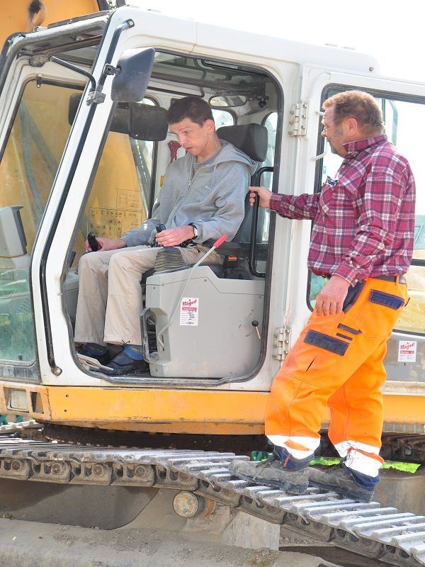 So einen Helfer hat Baggerfahrer Peter Schweikert auch nicht alle Tage. Neben dem Eduard Knoll Wohnzentrum in Krautheim entsteht ein neues barrierefreies Wohngebäude. Und zum feierlichen Spatenstich ist Peter Schweikert am Montag mit seinem Bagger angerollt. Extra für Klaus Lehmann, der den Spatenstich durchführen darf.
