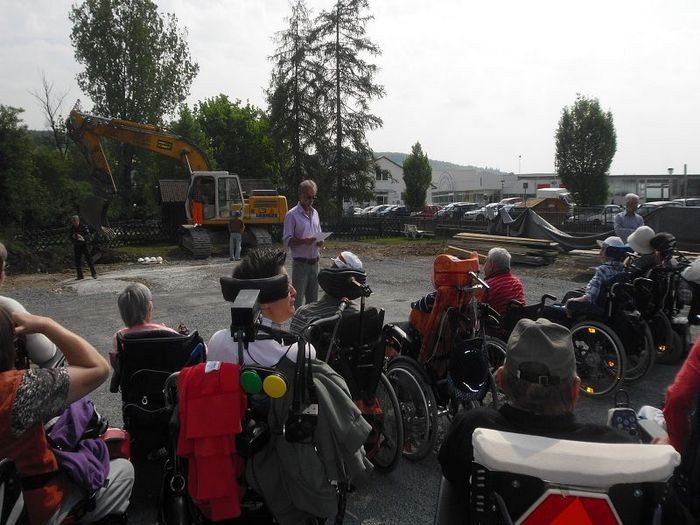 Danach nehmen EKWZ-Leiter Norman Weyrosta, Ulf Schwarz vom Bundesverbands Selbsthilfe Körperbehinderter, Bauleiter Michael Balbach, der stellvertretenden Krautheimer Bürgermeister Roland Rüdinger und Helmut Augustin von der Sparkasse Neckartal-Odenwald die richtigen Spaten in die Hand. Doch Klaus Lehmann hat ihnen an diesem Tag die Show gestohlen. Das stört Norman Weyrosta aber gar nicht. „Es ist schön, dass Klaus das machen konnte“, sagt der Leiter des Eduard Knoll Wohnzentrums.
