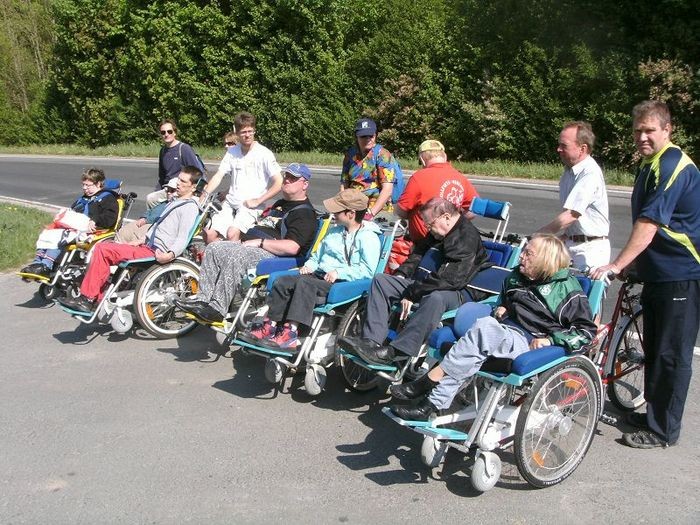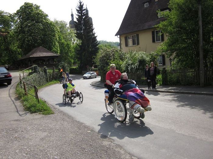 Am Freitag, den 29. April um 10:30 Uhr ging es schließlich erstmals los: Die Rollstuhlbenutzer hatten sich in ihren Rollstühlen vor dem Eduard Knoll Wohnzentrum versammelt und wurden von Pflegern bestens vorbereitet in die Rollstühle für die Fahrräder umgesetzt. Im Begleitfahrzeug ging es zunächst nach Neunstetten.