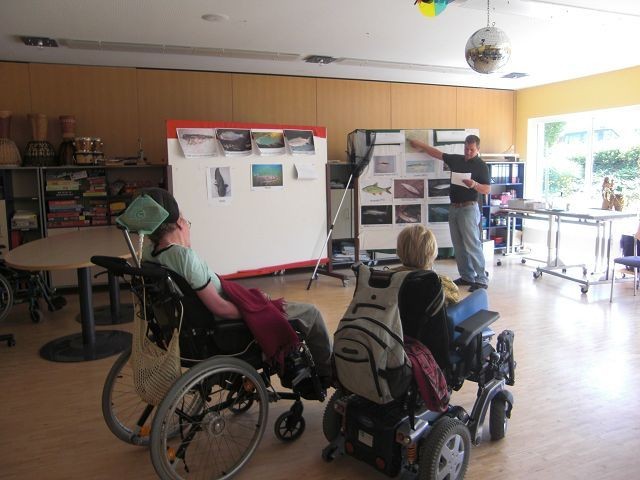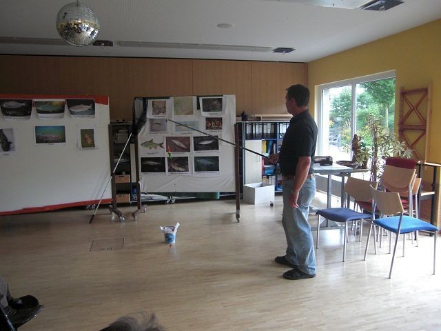 Am Dienstag, den 7. August, um 14:00 Uhr ging es dann los. Im Veranstaltungsraum kamen mehr Bewohner, als sich Thomas dachte. Mit einer Angel, die er auch als Zeigestock benutzte, stand Thomas an den Pinnwänden. Fische und Jagst erklärte er durchaus mit ein bisschen Schalk in Nacken.