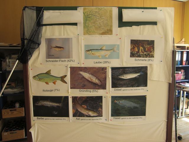 Er forschte selbst über Wikipedia und andere Quellen das Leben in und um die Jagst aus. Steffen, ein Mitarbeiter der Öffentlichkeitsarbeit druckte ihm für seine Schautafeln Bilder der am häufigsten vorkommenden Fische der Jagst aus.