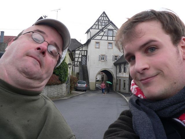 Da ich vergessen hatte, die Batterie meines E-Rollis aufladen zu lassen, hatte ich batterietechnische Probleme und wunderte mich, überhaupt so weit gekommen zu sein. Ich spielte nun für Cory den Reiseführer und erklärte ihm etwas vom Stadtteil „Berg“. Vor dem Torbogen zur Burg machten wir noch ein Erinnerungsfoto.