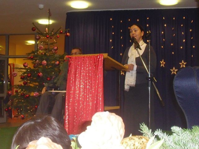 Die Feier begann mit zwei Weihnachtsliedern. Einige Mitarbeiter versammelten sich dazu auf der Bühne, und mit Unterstützung von Sabine Schüll am Cello und und Johanna Maisch am Klavier sangen alle gemeinsam.