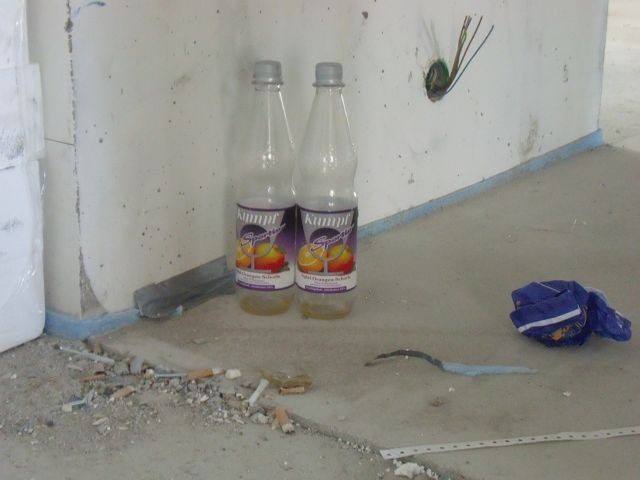 Heute hab' ich innen vom Rohbau die nicht alltäglichen Dinge fotographiert. Kabel, die aus der Wand hängen, die leeren Becher, die herumstehen, oder die lustigen Zeichnungen an den Wänden.