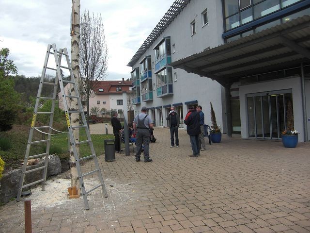 Obwohl es dieses Jahr gar nicht so sicher war, ob es bei uns überhaupt einen Maibaum geben würde. Aber dann haben es doch geschafft, auch ohne Zivis, genug starke Männer zum Helfen zu finden. Dank unsere fleißigen Hausmeister, unserem Koch und Pflegekräften wurde mit vereinten Kräften ein wahres Monstrum von Baum in unseren Hof geschafft.