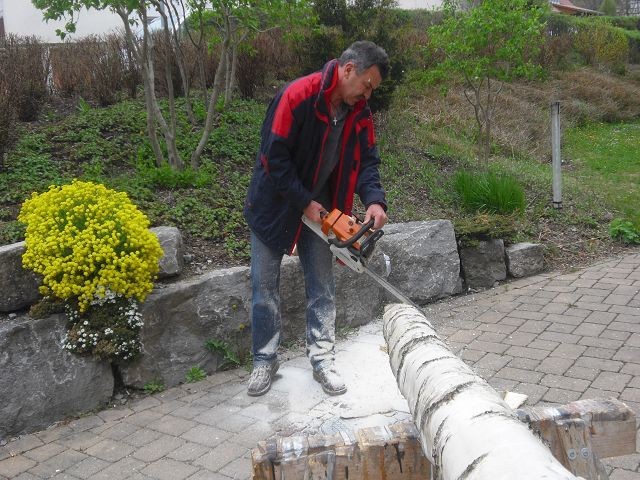 Und auch unseren Koch konnten wir mal bei der Arbeit sehen. Ob er in der Küche auch so geschickt mit den Küchengeräten umgeht wie hier mit der Säge?