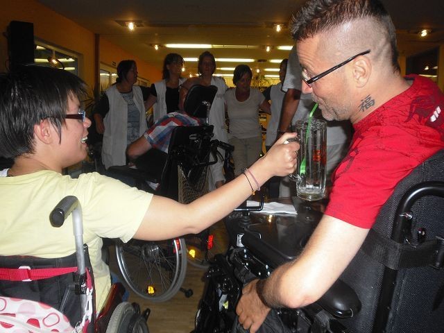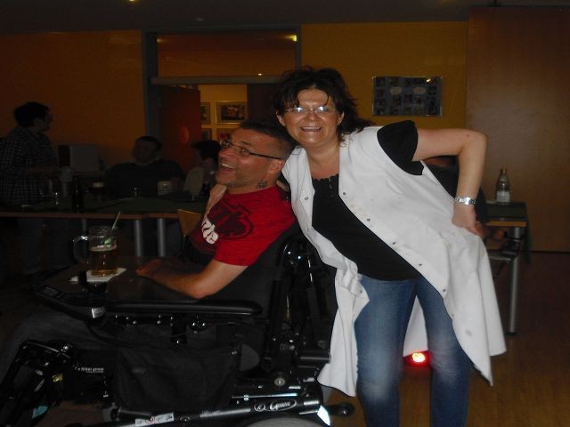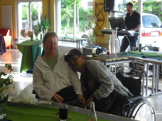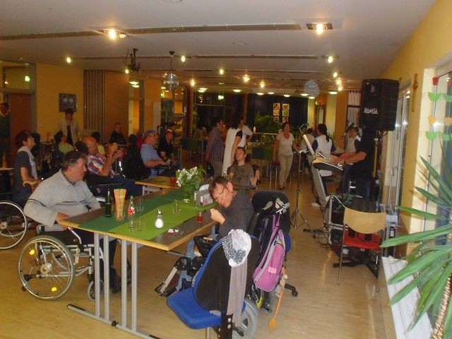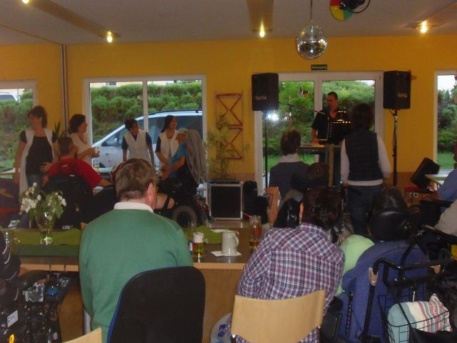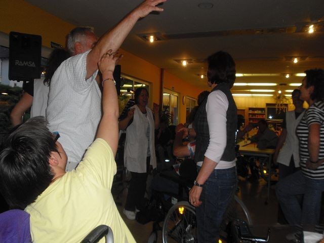 Nach dem Essen wurde dann nach Lust und Laune gefeiert. Für den einen hieß das, noch das ein oder andere Getränk, oder einfach nur der Musik zuhören oder reden, und für den andern erst mal ein bisschen Bewegung nach dem reichlichen Essen. Und hier kam dann die Stunde für unseren Christoph, der eigentlich nach Hause wollte, aber es einfach nicht übers Herz brachte, die vielen Wünsche nicht zu erfüllen. An dieser Stelle also einen ganz herzlichen Dank und hoffentlich waren die Kinder nicht allzu sauer. Dank Christophs Musik entstand eine gute Stimmung und es war besonders schön, dass Bewohner und Mitarbeiter der Pflege und Küche zusammen Spaß hatten.