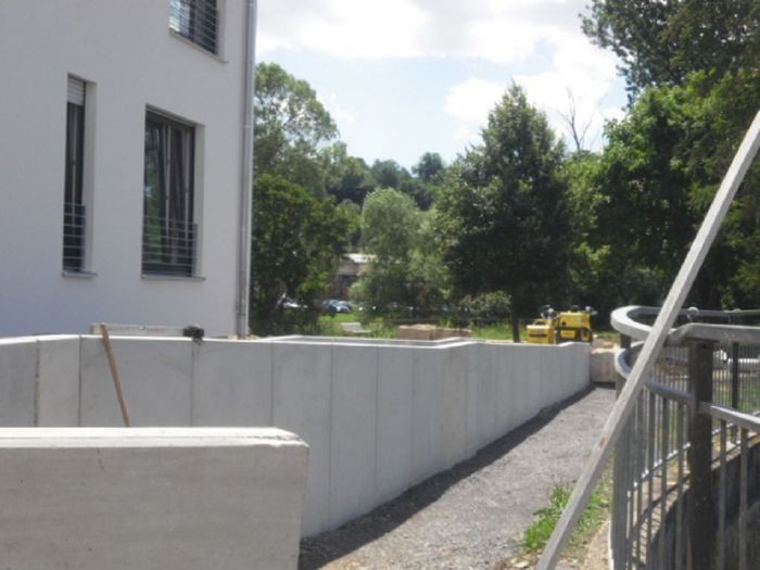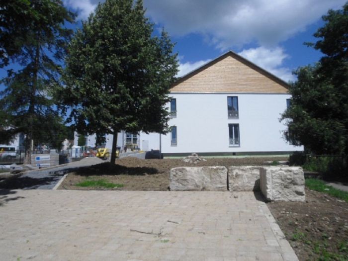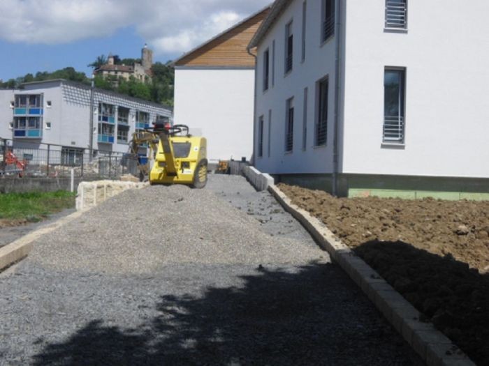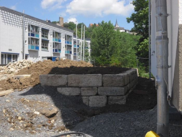So langsam aber sicher sieht man an der Außenanlage, was daraus werden soll. Noch können die Rollis nicht an das Haus heranfahren, da das Gelände zur Straße hin erst mal auf das gleiche Niveau gebracht werden muss. Hier und da werden die Steine der "Alten Mühle" in das Gelände integriert.