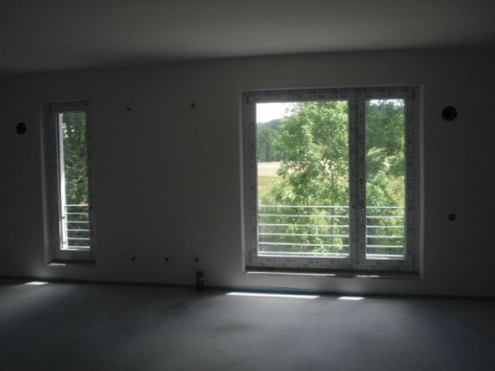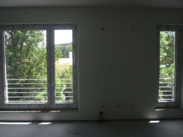 Innen ist jetzt alles tapeziert und bereits gestrichen. Und endlich sind die Schutzfolien von den Fenstern entfernt, sodass man die Aussicht schon jetzt genießen könnte.