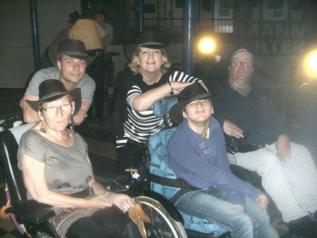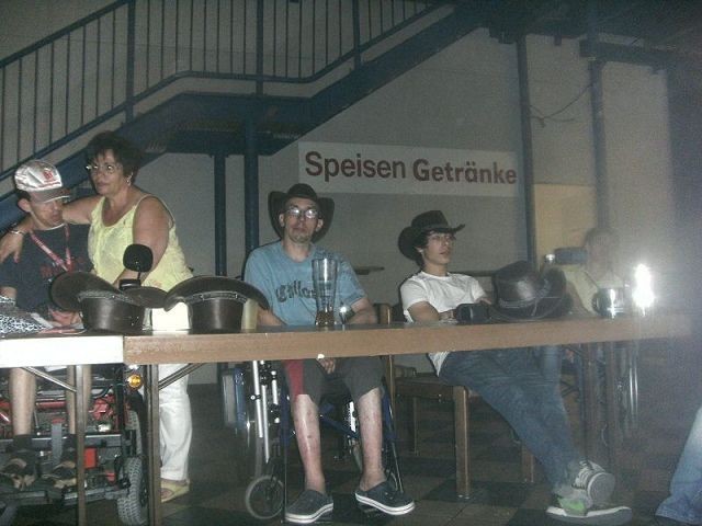 https://www.mann-hummel.com/de/corp/gruppe/standorte/deutschland/ kam an unseren Tisch und unterhielt sich mit uns. Er fand es toll, dass wir als Rollifahrergruppe solche Unternehmungen machen und überraschte uns mit einem Geschenk. Er und seine zwei Kollegen überreichten jedem von uns Rollifahrern und unseren drei Begleitpersonen einen Cowboyhut. Die drei gaben sich große Mühe, für jeden einen Hut in seiner Größe zu finden.